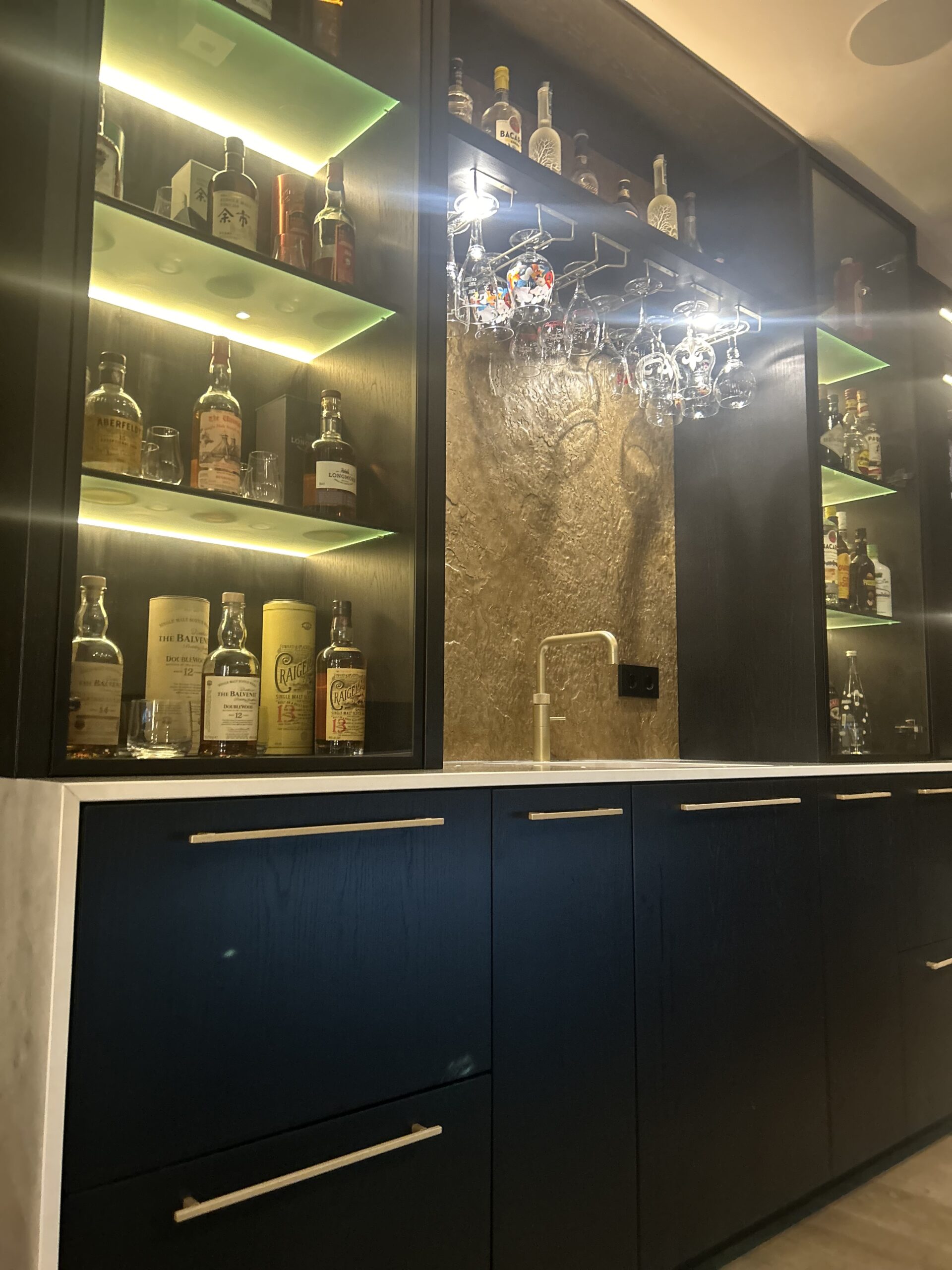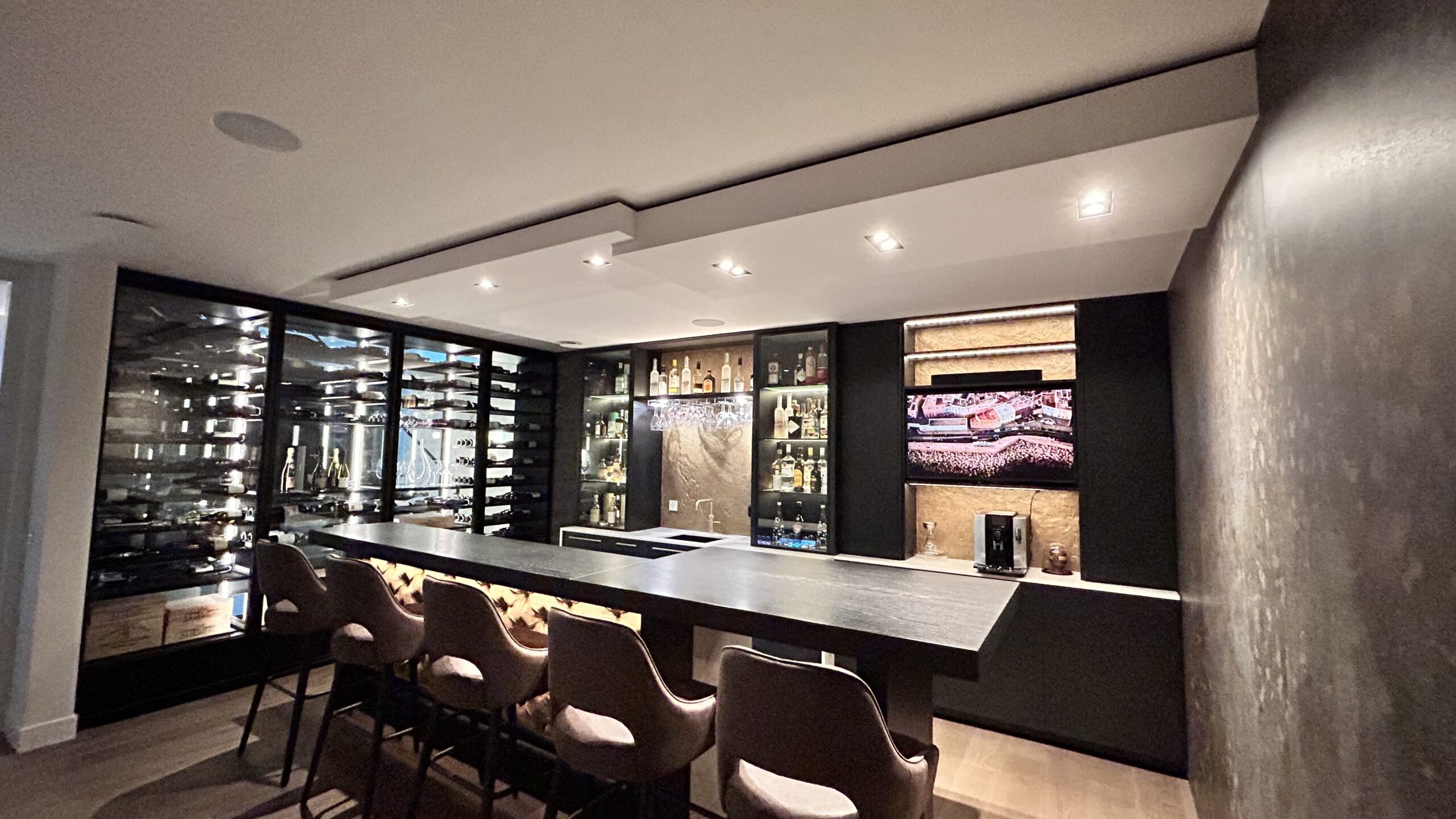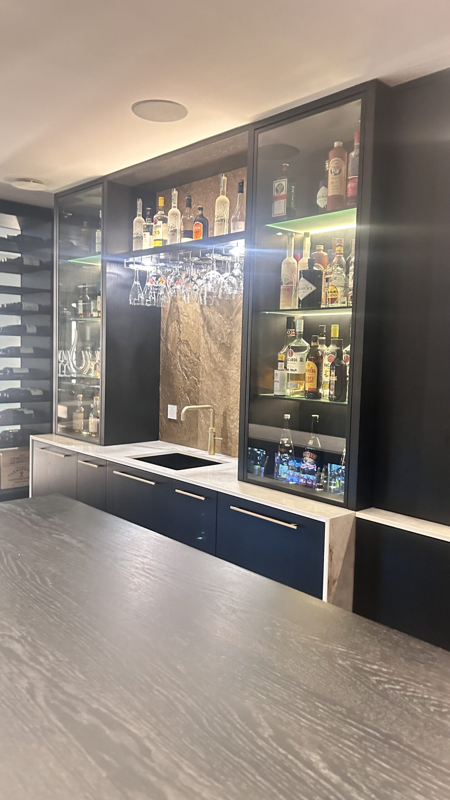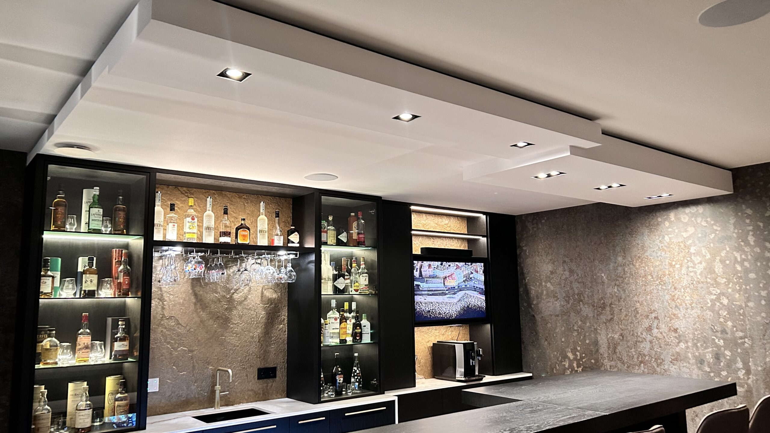 Graag laten wij u deze door ons ontworpen en gemaakte mooie thuisbar zien . Hier hebben we het gestucte plafond in lagen aangebracht en de bar uitgevoerd in zwart gebeitst eik afgewerkt met marmer white keramiek bladen .