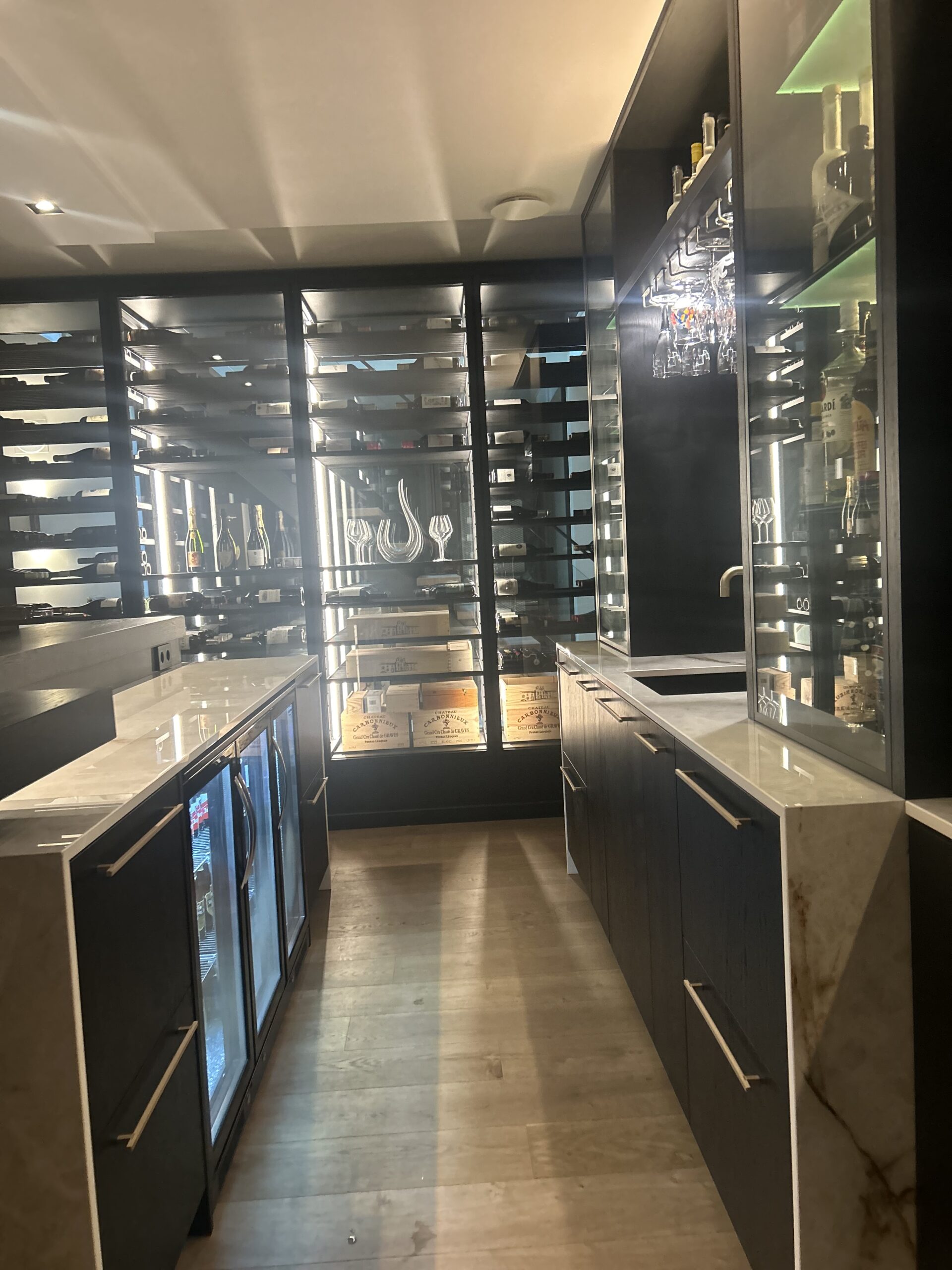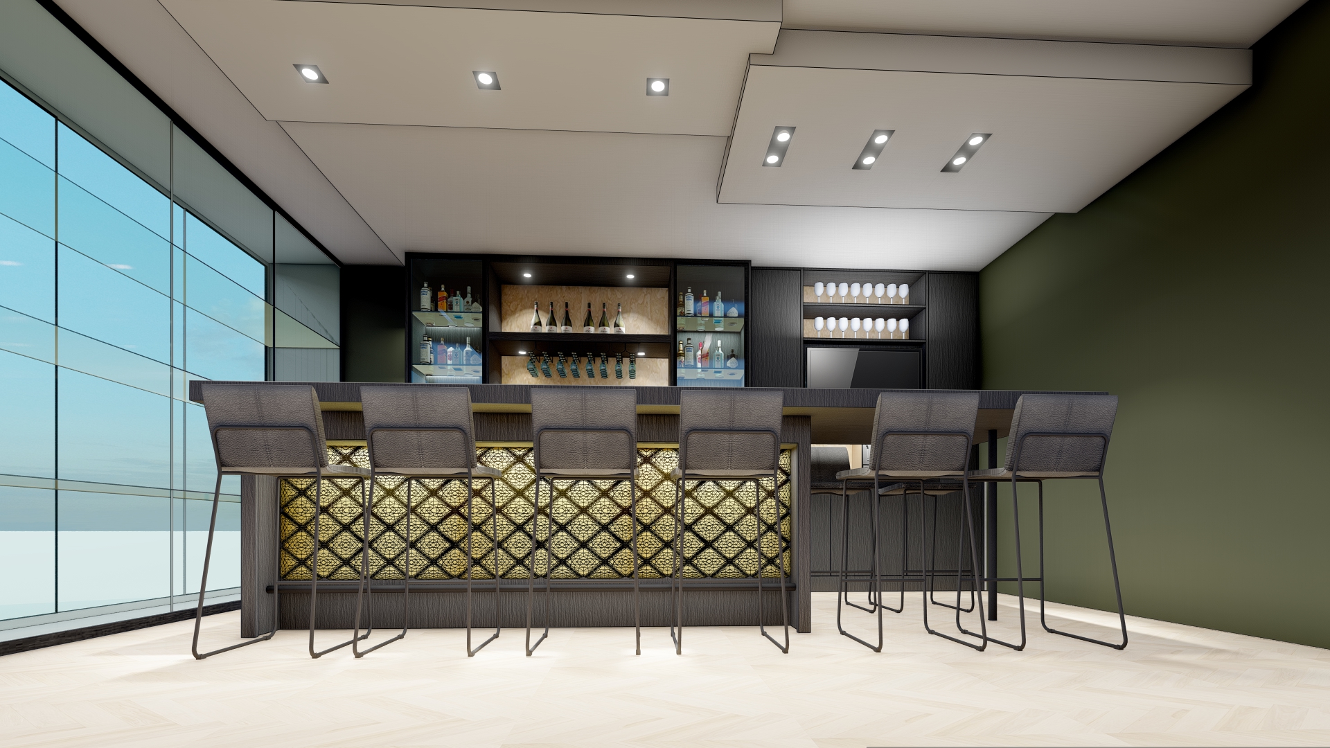 de vele custom made mat gouden details zoals grepen en de door ons in mat goud uitgevoerde Quooker kraan geven het geheel een exclusieve en luxe uitstraling . De achterwanden zijn bekleed met metal stuc gold wandpanelen . En de omliggende wanden afgewerkt met designpanelen van Bennaci .Tailormade chesterfield gouden stoffering en de exclusieve hotel stoelen maken het geheel compleet . Kortom weer een geweldig project afgerond !
